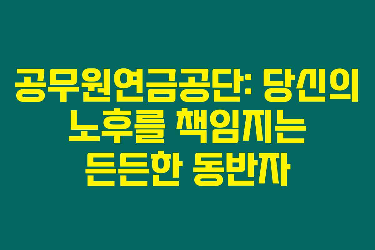 공무원연금공단은 공무원과 그 유족을 위한 강력한 파트너로서 노후를 프로테크하거나 다양한 지원을 통해 추후의 안정적인 생활을 도모하고 있습니다. 당신에게 필요한 지원이 있다면 적극적으로 이용해보세요. 다양한 복지 혜택이 여러분을 기다리고 있습니다.