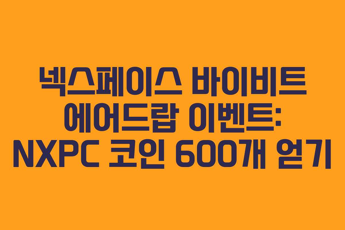 2025년 5월 14일부터 5월 28일까지 바이비트에 신규 가입 후 100 USDT 입금 및 NXPC 거래(또는 1,800 NXPC 입금) 시 600 NXPC를 지급하는 에어드랍 이벤트가 진행됩니다. 이 이벤트는 바이비트가 주최하며, 넥스페이스 코인의 상장 및 유저 유치가 주요 목적입니다. 기존 회원도 거래량에 따라 보상을 받을 수 있습니다.