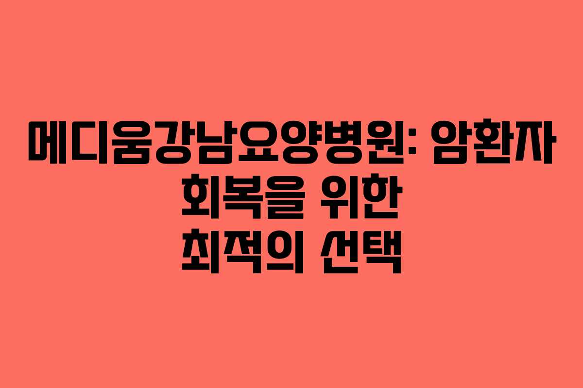 메디움강남요양병원은 암환자의 회복을 돕기 위해 특화된 치료와 맞춤형 식단을 제공하는 병원입니다. 대형 암센터 인근에 위치하여 정기적인 항암 및 방사선 치료를 받기 용이한 장점을 가지고 있습니다.