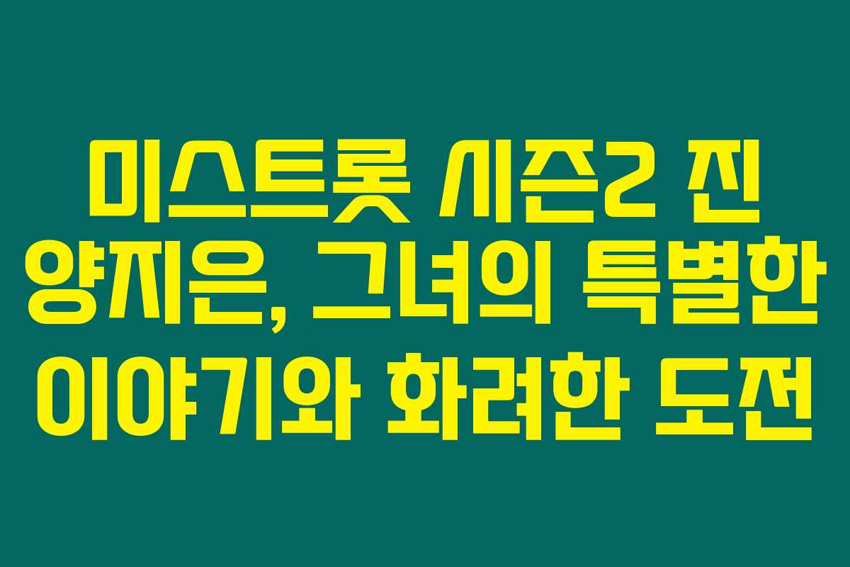 미스트롯2의 진 양지은은 단순한 가수가 아니라 우리의 삶에 감동을 주는 인물이에요. 그녀의 이야기가 많은 사람들에게 위로와 희망이 될 수 있잖아요? 양지은처럼 자신의 꿈을 향해 나아가는 사람들은 그녀를 통해 자신감을 얻고, 용기를 내어 도전하게 될 겁니다.
