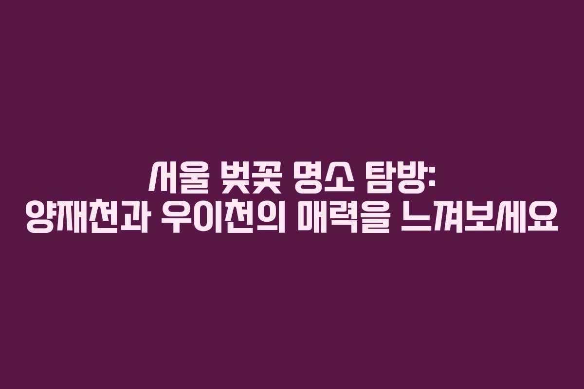 서울의 벚꽃 명소는 매년 많은 이들에게 감동을 선사하는 장소입니다. 양재천과 우이천의 아름다움을 만끽하며, 소중한 추억을 만들어 보시길 바랍니다. 벚꽃 시즌이 다가오면 많은 사람들이 이곳을 찾을 것이니, 미리 계획을 세워 방문하는 것을 추천합니다.