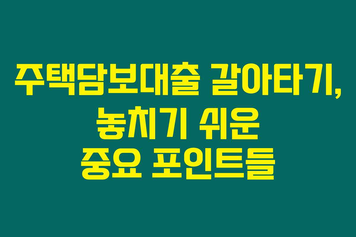 제가 직접 경험해본 결과로는 주택담보대출을 갈아타는 것은 재정적 여유를 만들어줄 수 있는 좋은 방법입니다. 그러나 대환대출을 진행하면서 실제로 주의해야 할 사항들이 많다는 것을 깨달았습니다. 아래를 읽어보시면 주택담보대출 갈아타기를 고민하시는 분들에게 큰 도움이 될 정보들이 가득합니다.
